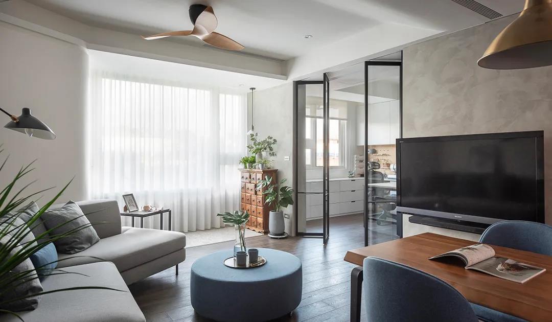 將工作室出入口重新調整位置,采用鋁框玻璃折疊門使其與客廳相互串連,
