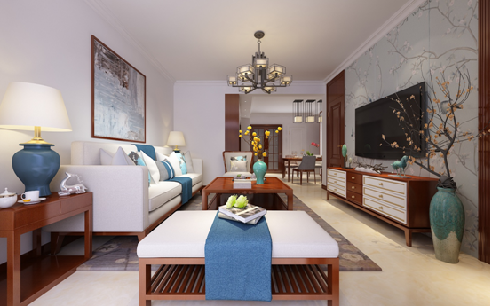 整個空間的色調為深色系,因為新中式的色彩可以使人緊張的神經系統和視覺神經得到很好的放松和舒緩壓力,客餐廳頂部做了些石膏造型,很好的突出了現代簡約新中式風格的線條感,既有層次,又簡單大氣,還不愛過時;背景墻采用局部木飾面與壁紙的結合,下面的電視柜是木質柜的,這樣下來,色彩與材質都一樣,才能保證效果,加上與壁紙結合,也突出了色差與層次的重要性與吸人眼球的效果,屢試不爽。