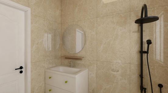 衛(wèi)生間在選擇瓷磚的時候選用了暖白色瓷磚,因為業(yè)主不希望空間太冷,馬桶朝向應(yīng)客戶要求調(diào)整了方向,貼心的考慮到了業(yè)主的生活起居。白色的木質(zhì)浴室柜,透露出自然與原始之美,能充分體現(xiàn)主人的家居檔次和身份的尊貴。