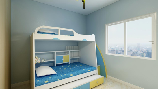 兒童房 的設(shè)計以色彩豐富表現(xiàn)這個空間,因為是男孩子居住 所以壁紙運用藍(lán)灰色調(diào),柜子上運用下汽車的卡通造型更加符合男孩子的喜好,并設(shè)計了書柜和隔板層,方便以后孩子放置書籍畫冊和玩具的收納
