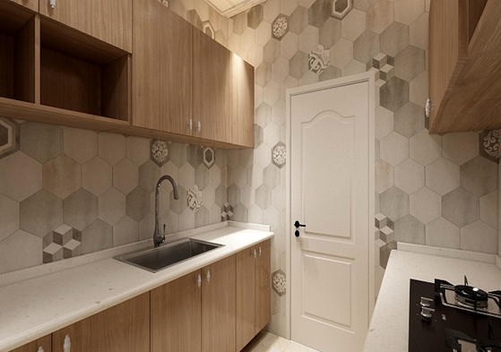整體櫥柜實用為主,地面、墻面與頂面都以淺色調(diào)為主,搭配上淺色櫥柜門板深色臺面,顯得穩(wěn)重大氣。由于空間比較局促,水盆和灶具都選擇小巧型的,增強(qiáng)空間利用率,并向上方也做了櫥柜,并搭配小型儲物柜,可以儲藏生活用品。
