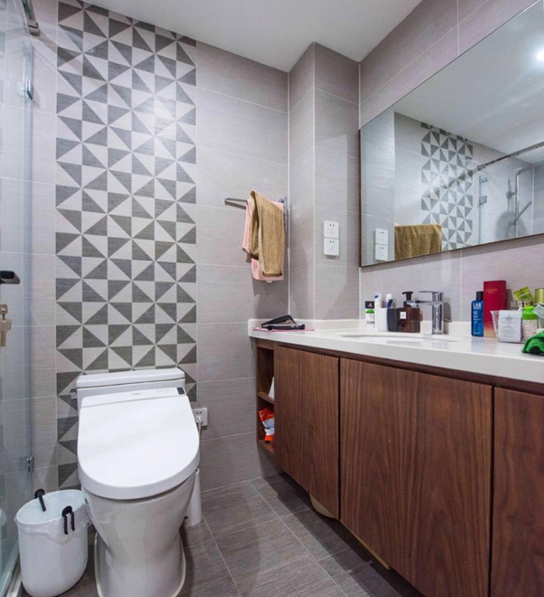 衛生間的深淺搭配看起來很舒服,深色木質浴室柜看起來更有質感,淺色墻磚搭配深色腰線使整體空間更具層次感,坐便后面的背景設計使得整體空間看上去不再單調。整個衛生間以業主的生活習慣為出發點,簡潔大氣并具有功能性。