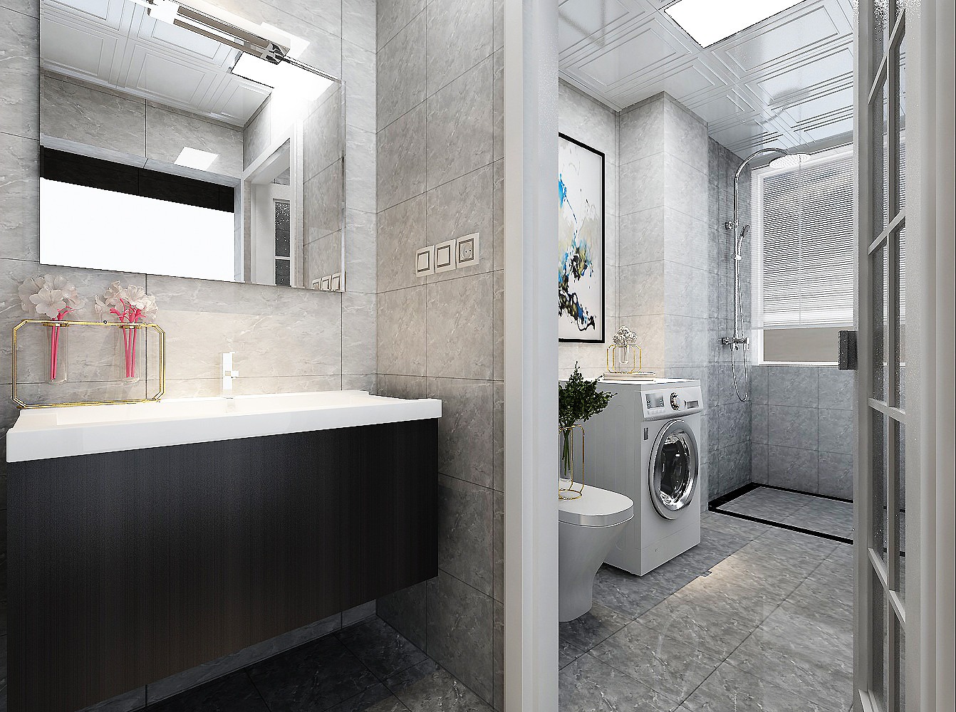 衛(wèi)生間采用深灰的墻地磚,因為這個磚也是深色系,鋪完之后整體很高檔,因為衛(wèi)生間本身就是容易臟的空間,建議是采用色調比較深的瓷磚,這樣的話整體效果較好而且好打理,衛(wèi)生間是接近正方形,所以洗衣機與浴室柜對面放也沒有問題,空間利用更合理,灰色版的墻磚,層次感更強。