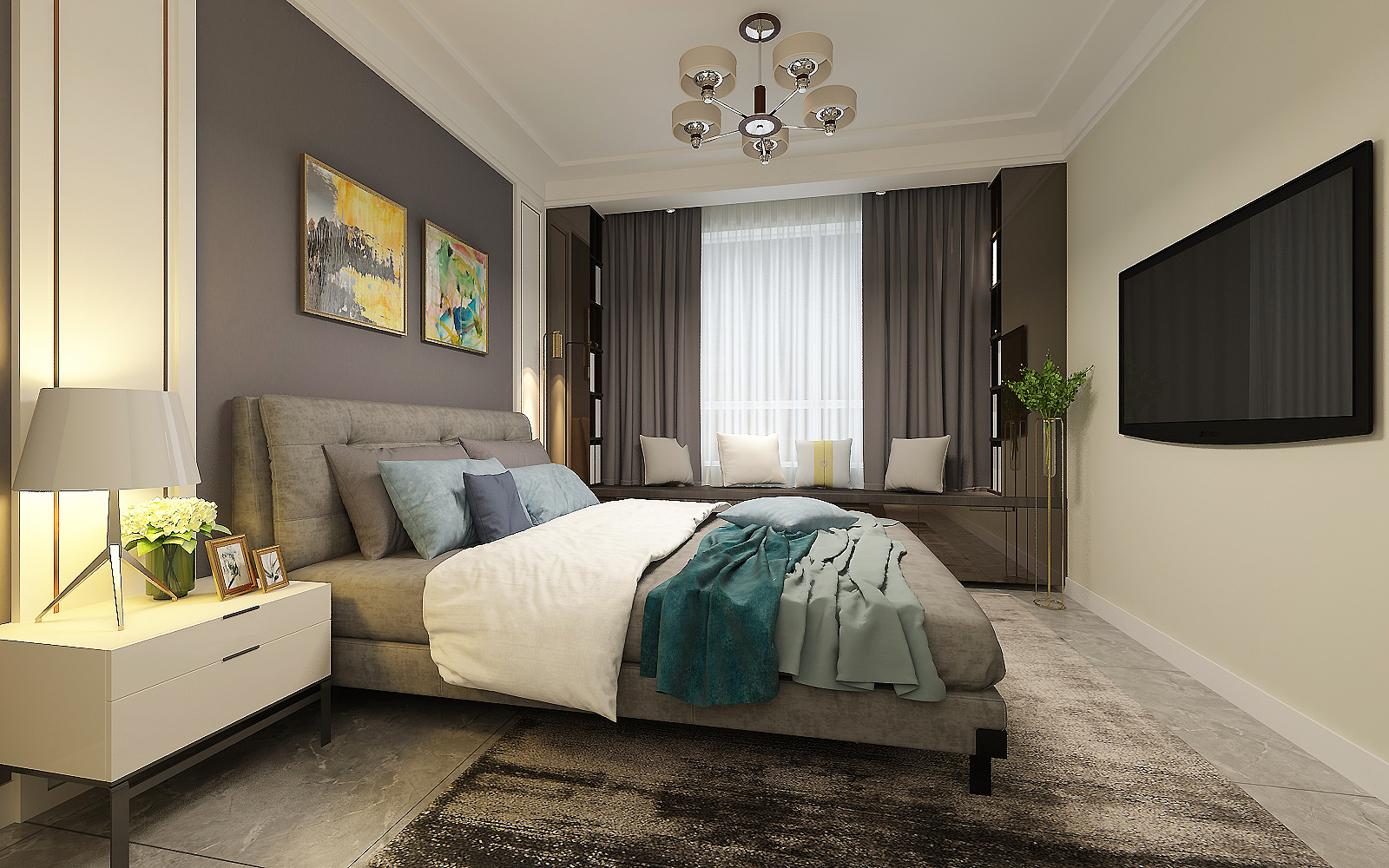 主臥室面積不算小,在墻漆顏色上與客廳不同,采用比較溫馨的暖灰色,這個顏色既有保護眼睛的作用,又可以增加人的睡眠質量,是很慵懶的一個顏色,效果也不非常好,這是經過多次的實踐證明。在空間布局上,把大衣柜放到了電視墻的對面,這樣不僅使得衣柜能過做到最大化,增加儲物,有使室內活動區(qū)域很寬松,不擁擠,也很溫馨,是目前大多數(shù)年輕人的選擇。