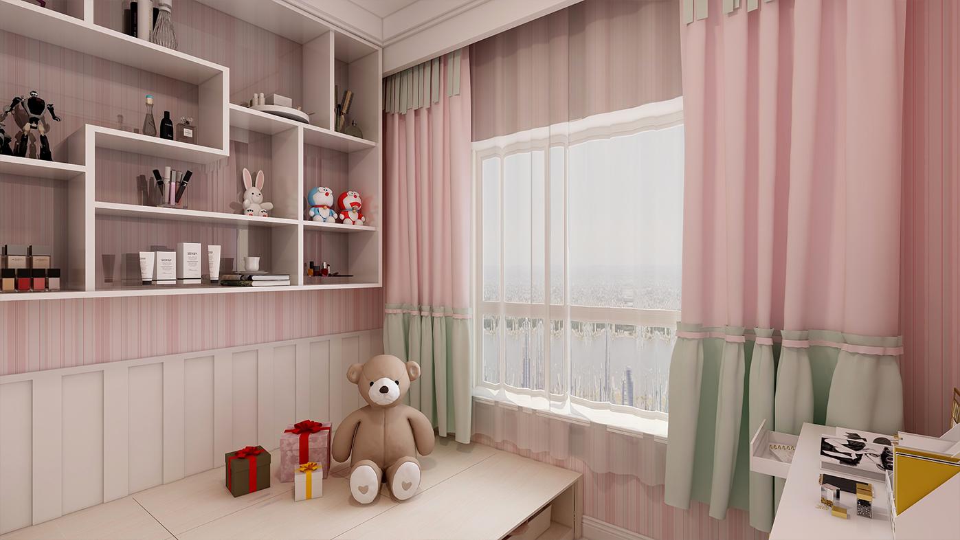 這個臥室做的榻榻米,考慮到女孩兒化妝品和衣服之類的東西比較多,所以選擇榻榻米可以增加儲物空間,通過我們交流,我就感覺每個女孩都有一個公主夢,加上他女朋友白白凈凈,穿著粉色的上衣,我就感覺來一個粉色調的公主房,突出甜美的感覺。搭配也稍稍的采用了一些卡通元素,但不是那種很幼稚的卡通,靠窗戶的地上還加了一個圓形小地毯,提供娛樂和休閑。