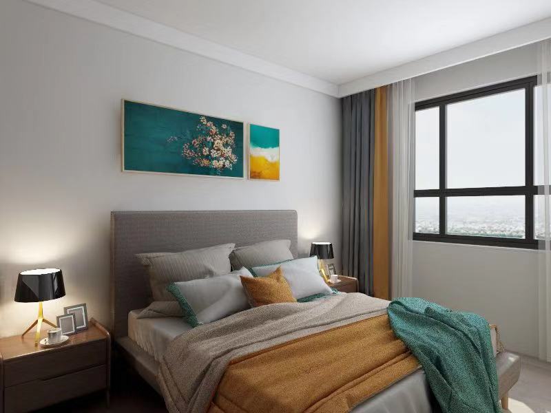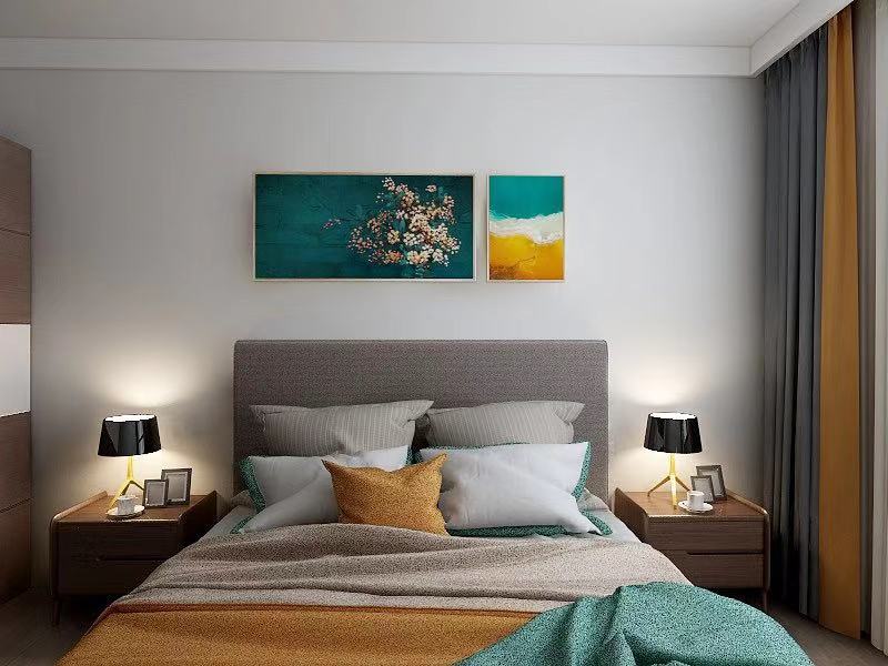 臥室以舒適為主,顏色不宜太暗,要避免使用大面積深色以防止悶重的感覺。所以在臥室的配色上用淺色調來進行調和。床頭上配簡單裝飾畫來點綴