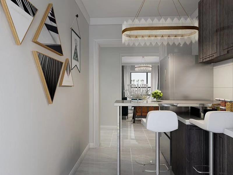 1. 廚房面積不算大,但是客戶想把冰箱放餐廳,經過模型布置方案設計決定把冰箱放到餐廳,做個吧臺,這樣寬敞明亮,客廳空間大,隔出一個生活陽臺所以客廳布局比較簡單,除了生活中必備的一些東西,沒有多余的布置。從而使得客廳整體空間更簡潔大氣明亮。