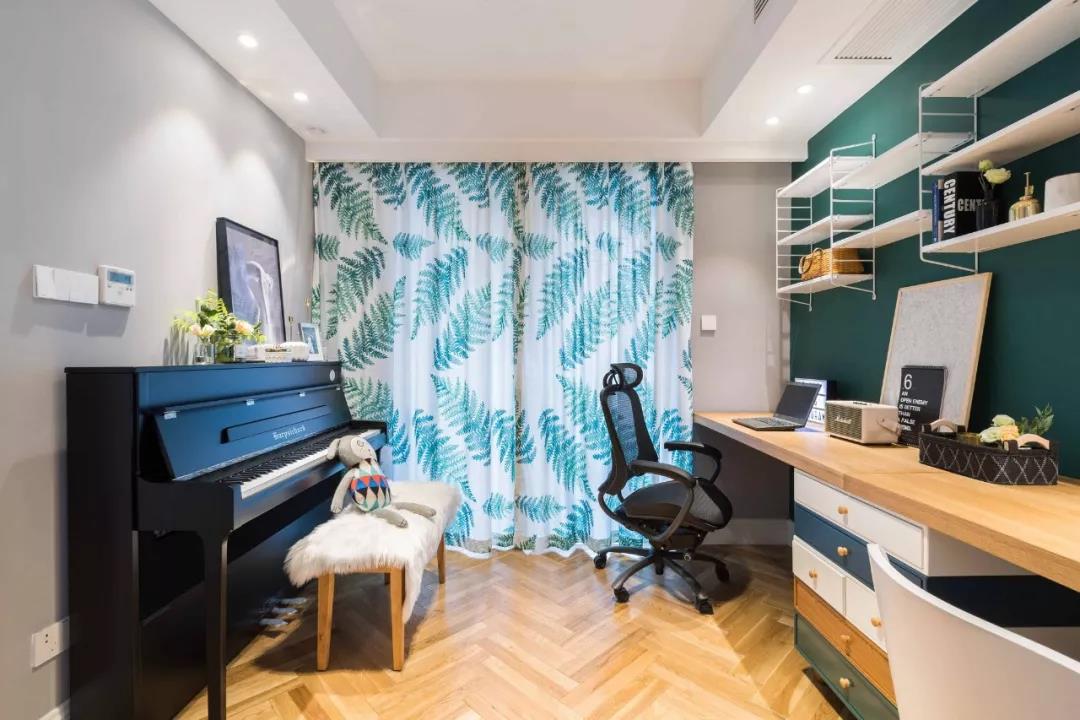 位于客廳沙發(fā)背后的書房空間,灰色和青色的墻面形成對比,把鋼琴和書桌區(qū)域分開,墻面的置物架搭配雙人書桌的設(shè)計,滿足了書房的收納需求