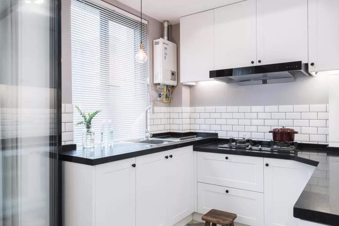 用折疊式玻璃門將廚房和餐廳隔開,玻璃門既阻擋了油煙的蔓延,又保證了廚房的采光通透性,有利于做飯時家人之間的溝通。廚房門旁邊的仙人掌在空間上也起到了一定的隔斷作用。廚房內(nèi)部是U字型的櫥柜布局,白色的柜體、黑色的臺面、小白磚、灰色墻漆的運用,讓廚房層次分明,折疊門的使用也讓廚房平時更顯寬