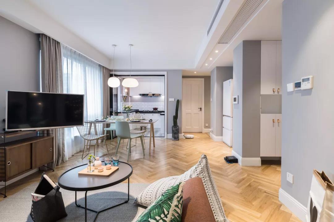 客廳的整個色調(diào)分為三個部分,一是墻面的淺灰色,低調(diào)中又帶點清新,二是吊燈的暖白色,干凈大氣,三是地板上的木色,三個顏色形成三個大色塊??筒蛷d地面都是相同人字拼接的木地板,讓整個空間的整體感和縱深感得以提升。