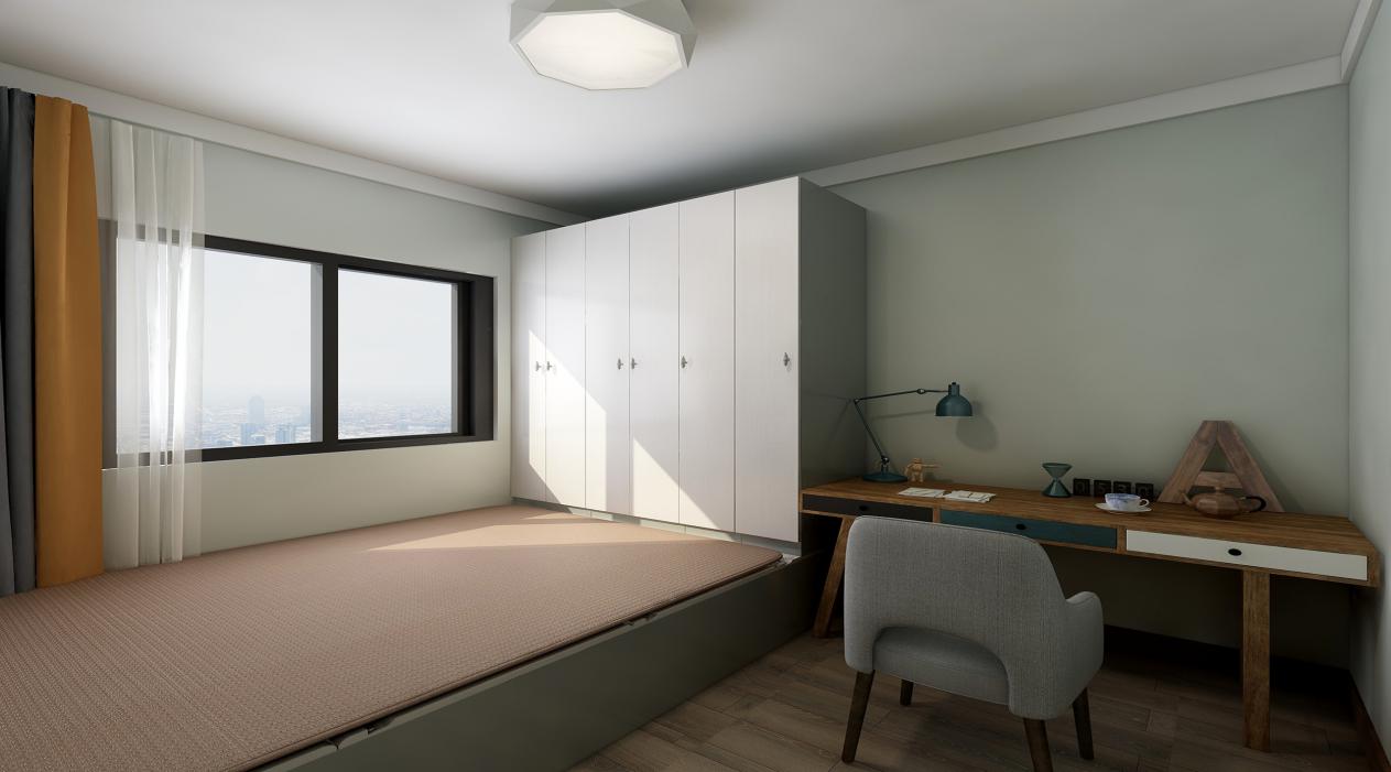 北書房做了一個東西方向通長的榻榻米,衣柜和書桌在一條線上,整潔、方便、實用,北面兩個臥室的色系都做了調整,換成了冷色系,配上深色的木地板,是房間不會顯的太冷,而又富有質感。由于榻榻米衣柜的限制,書房的窗簾只能選擇單窗簾向開啟。
