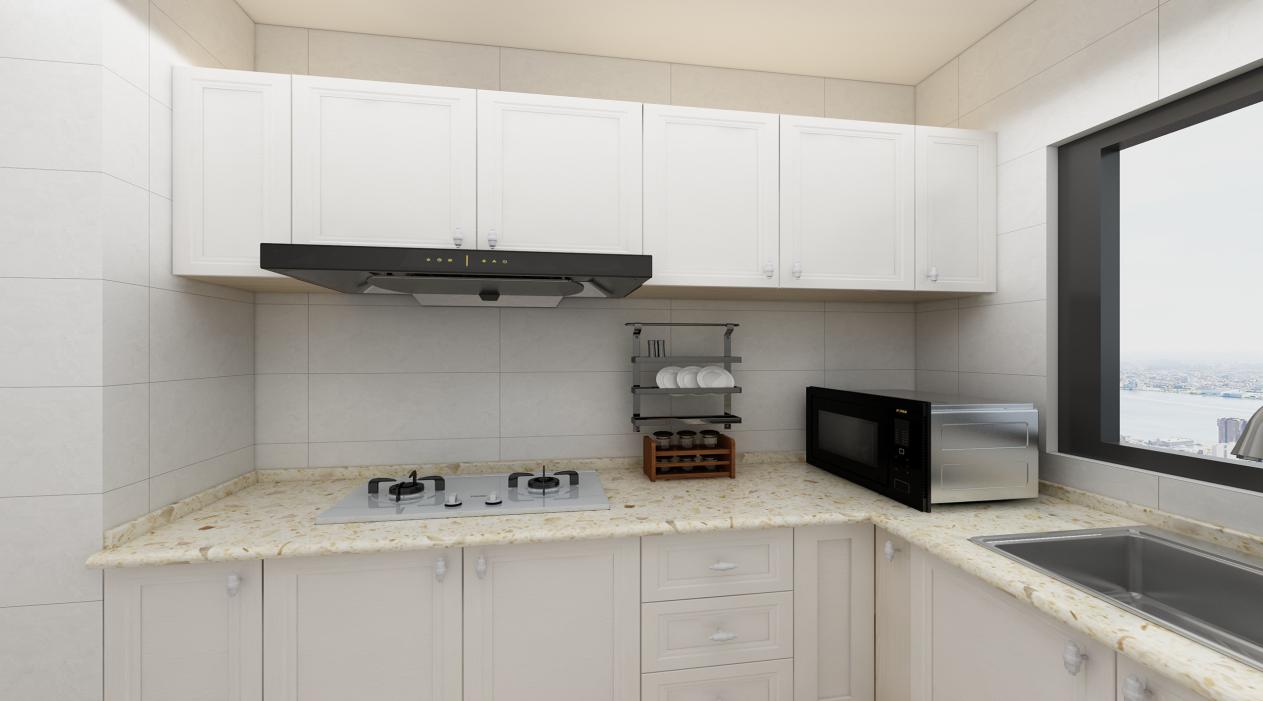 整體櫥柜實用為主,地面、墻面與頂面都以淺色調為主,搭配上淺櫥柜門板,顯得干凈整潔。水盆、操作臺和灶臺保證了洗切炒的順序,方便我們日常使用,L形地柜+一字形吊柜,最大限度的增加了廚房的儲物空間。
