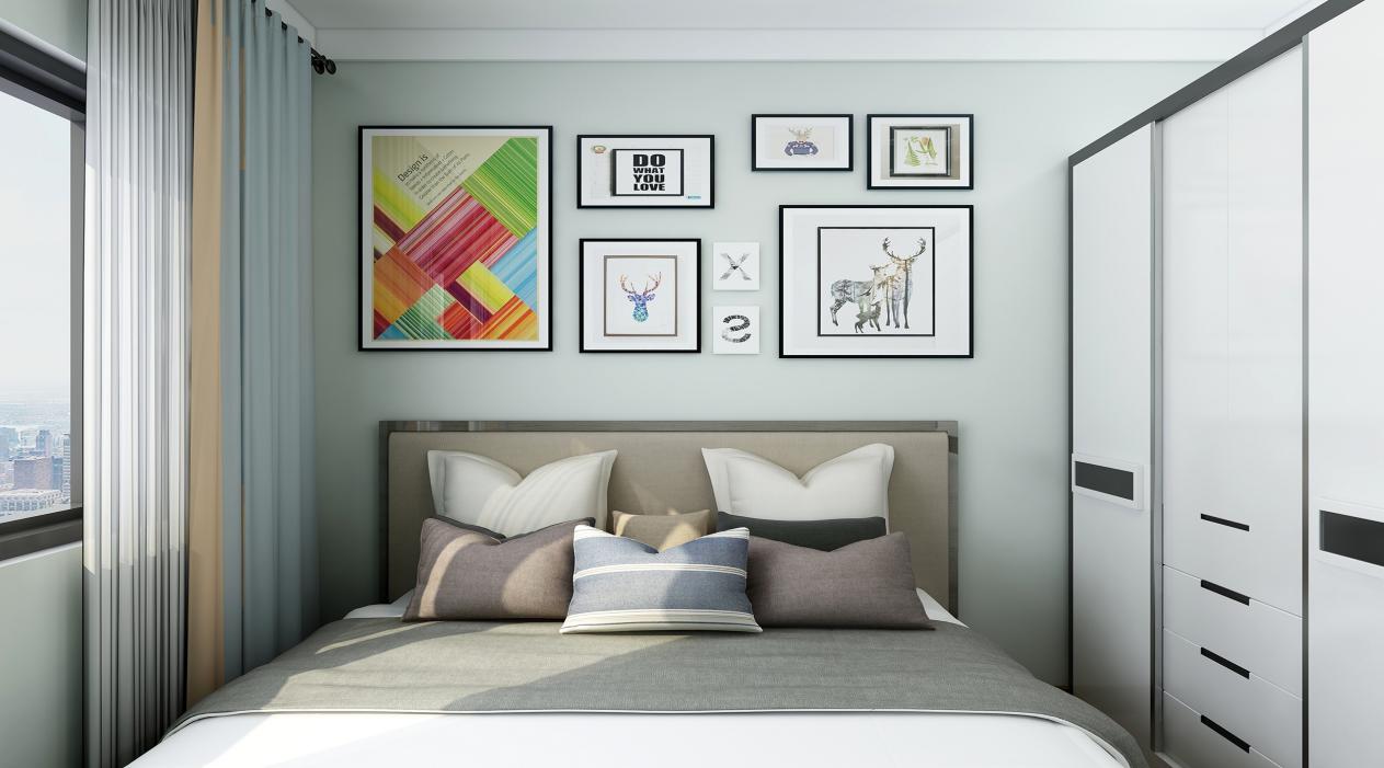 對于主臥室,配以了和客廳一樣的色系,配上一個現代風格的1.8米大雙人床,一組簡約的床頭裝飾畫,一定能給業主一個非常放松的休息的環境。而北側的通頂衣柜,大大的滿足了我們日常的儲物需求。最搶眼的就是南側的大飄窗,讀書、品茶、曬太陽、觀風景,都是美好的享受。