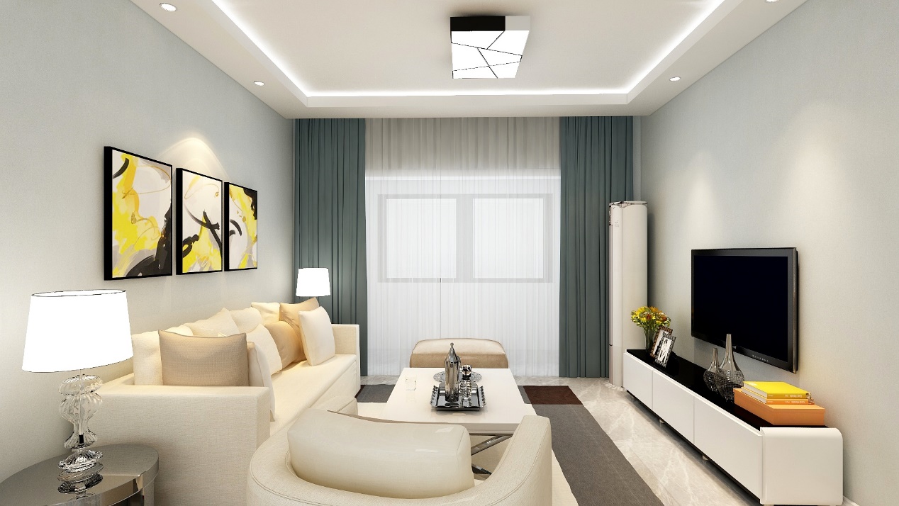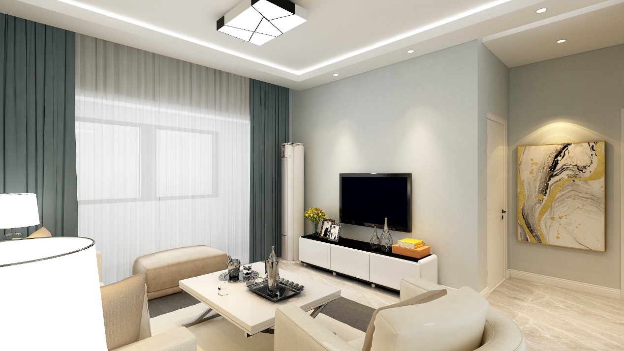 這套現代簡約的客廳設計以淺色為主色,再運用淡藍色的墻漆和米白色的沙發搭配,讓客廳充滿現代的氣息,十分的簡潔時尚。米白色的沙發搭配灰色的地磚和藍色的窗簾及淡藍色的墻漆,讓簡約的客廳充滿現代時尚溫馨的氣息,所以說現代簡約并不是過于強調簡約的設計,而是簡約和實用美觀的結合。