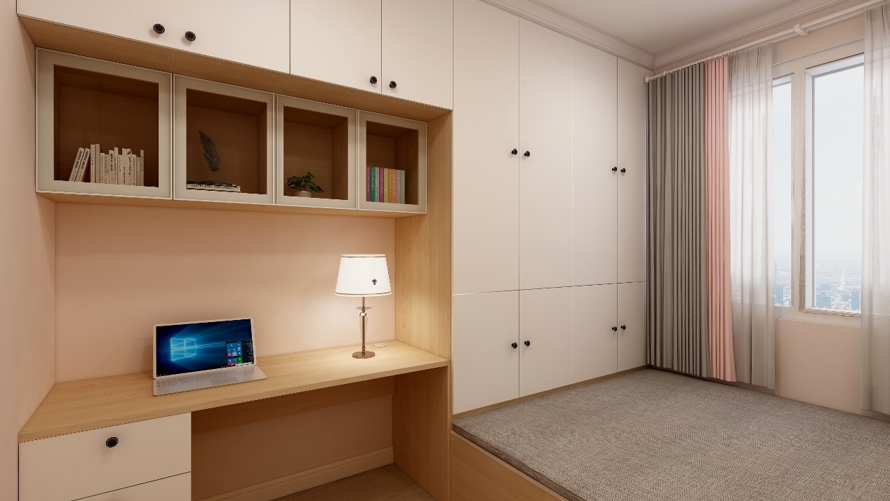 因為考慮到儲物空間及常住人口數量,考慮次臥室做了個榻榻米,榻榻米打破了垂直空間收納的慣例,內部柜子在水平地面也能發揮超強的儲物能力,是提升空間利用率的先行者。這樣既增加了整體的儲物空間又兼具寫字臺及書柜的空間。顏色上考慮用原木色和白色這兩種經典顏色做搭配,墻面搭配上孩子喜歡粉色。