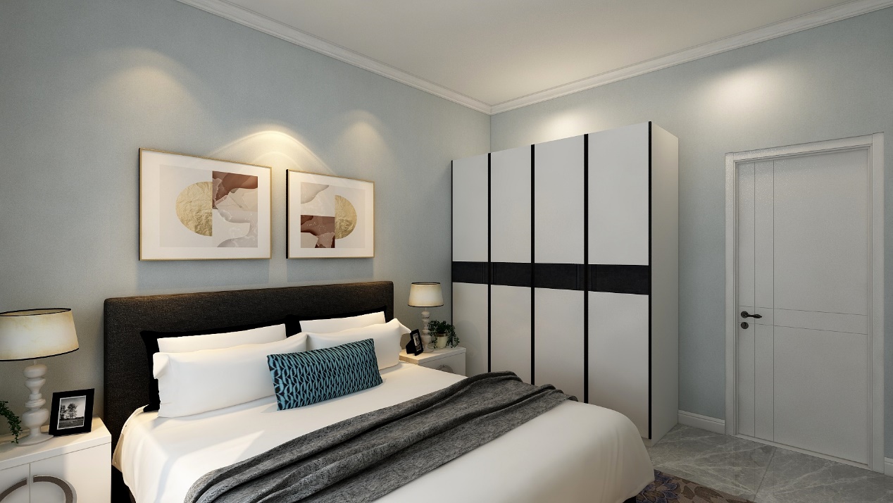 在臥室的設計上,要追求的是功能與形式的完美統一,優雅獨特,簡潔明快的設計風格。頂部是白色墻漆,墻面上是和客廳統一的淡藍色的墻漆,淺色的家具上深色的裝飾線條,使得整體設計簡單又帶有活力。在臥室設計的審美上,追求時尚而不浮躁,莊重典雅而不乏輕松浪漫的感覺。因此,在臥室的設計上,會更多的運用豐富的表現手法,使臥室看似簡單,實則韻味無窮