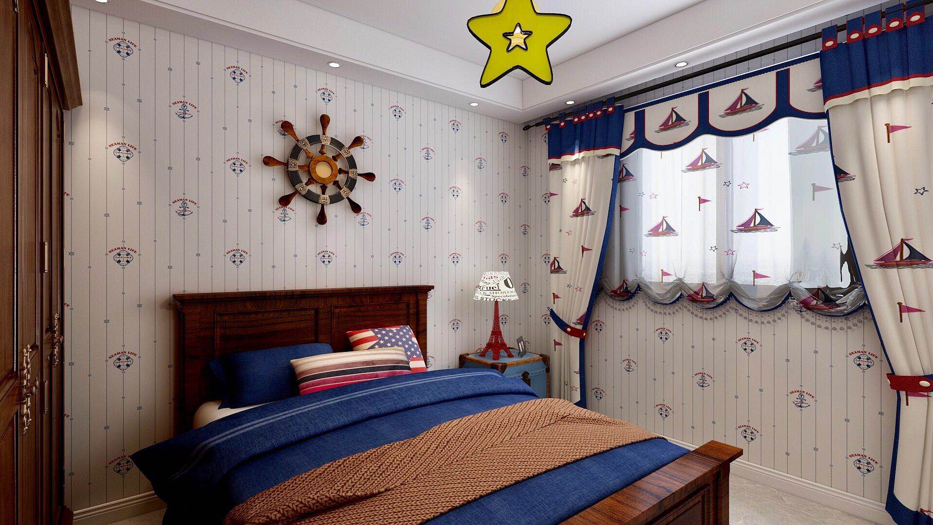 次臥室為兒童房,主人孩子現在還比較小,整體色調以藍色為主,整體清新自然,次臥選用了一個非常有趣的壁紙運用了很多的復古元素,打造了一個溫馨且有層次感的臥室空間,整體沒有過多的復雜裝飾,為業主提供的簡單的睡眠空間。