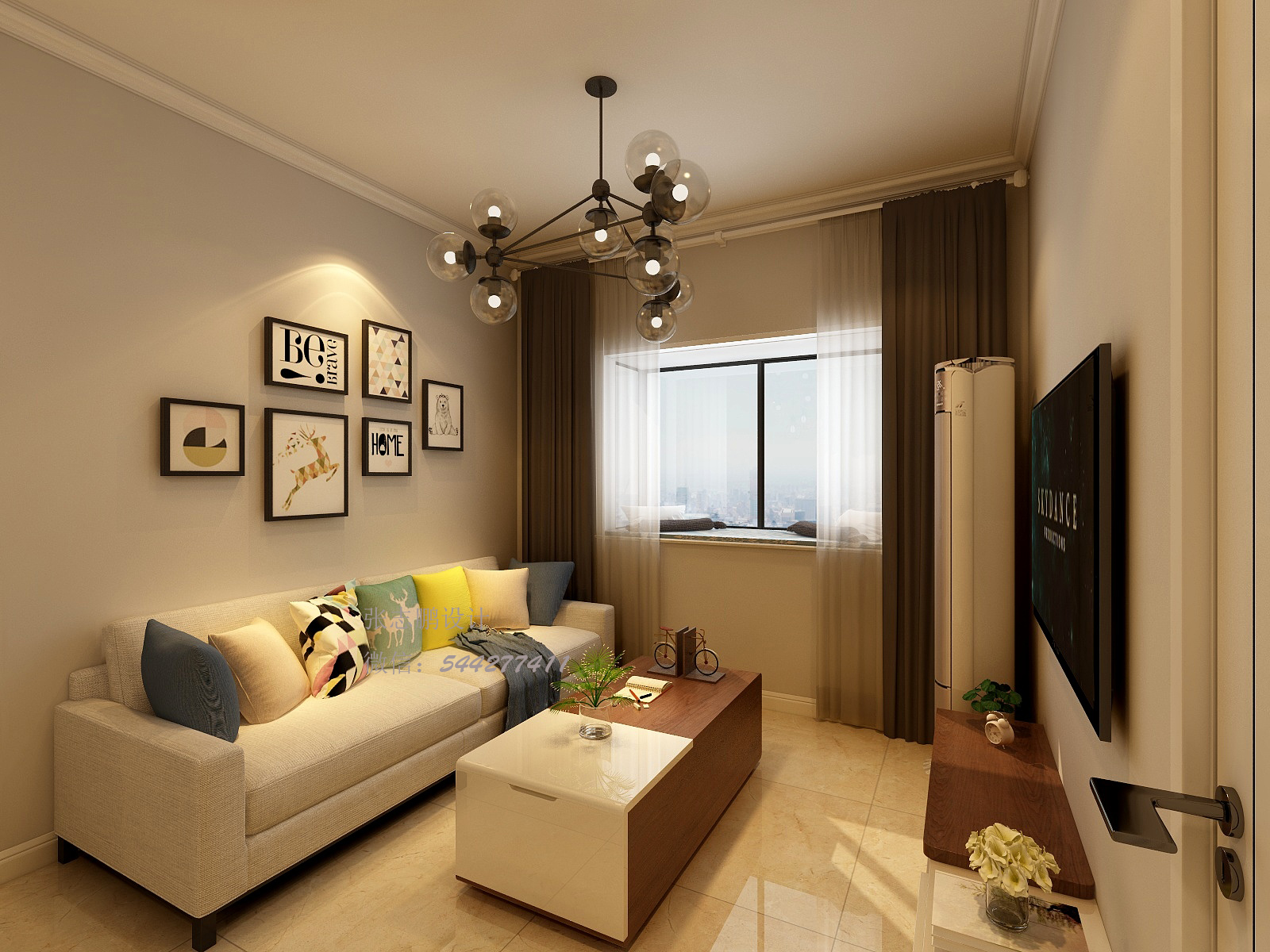 客廳上由于電視背景墻比較小,同時還要放置立式空調的原因,在設計上本著化繁為簡的原則,舍棄了背景墻的設計。因為空間的限制,無論做什么類型的背景墻,都會顯得局促和擁擠,會顯得很小氣。同理,頂面沒有做壓低頂面空間感的吊頂,而是做了石膏線,來美化墻頂面的交界線,同時整體色調上以淺色為主,鮮艷活潑的顏色作為點綴,突出年輕人使整個空間顯得明亮大氣。