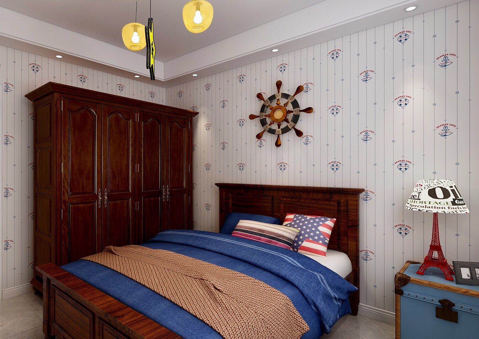 次臥室為兒童房,主人孩子現在還比較小,整體色調以藍色為主,整體清新自然,次臥選用了一個非常有趣的壁紙運用了很多的復古元素,打造了一個溫馨且有層次感的臥室空間,整體沒有過多的復雜裝飾,為業主提供的簡單的睡眠空間。