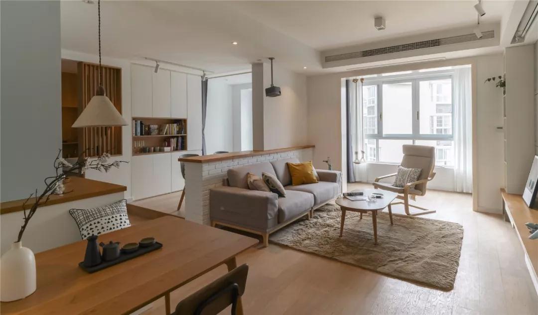 客廳與書房打通并以矮墻吧臺隔開,帶給了客餐廳額外的采光,原本短促的視野也幾乎增長了一倍,顯得寬敞了許多。
