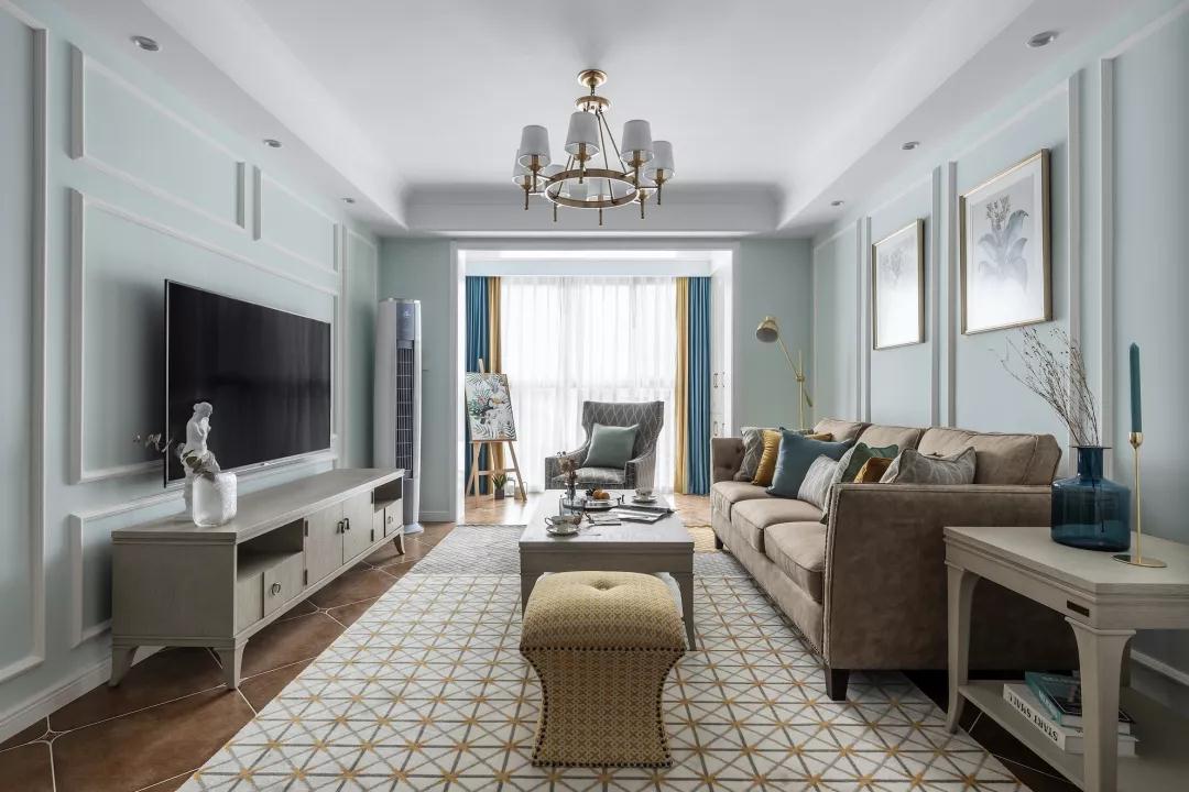 客廳以淡藍色與白色為基調,視線所及明亮而溫和,營造清新浪漫的舒適感受。