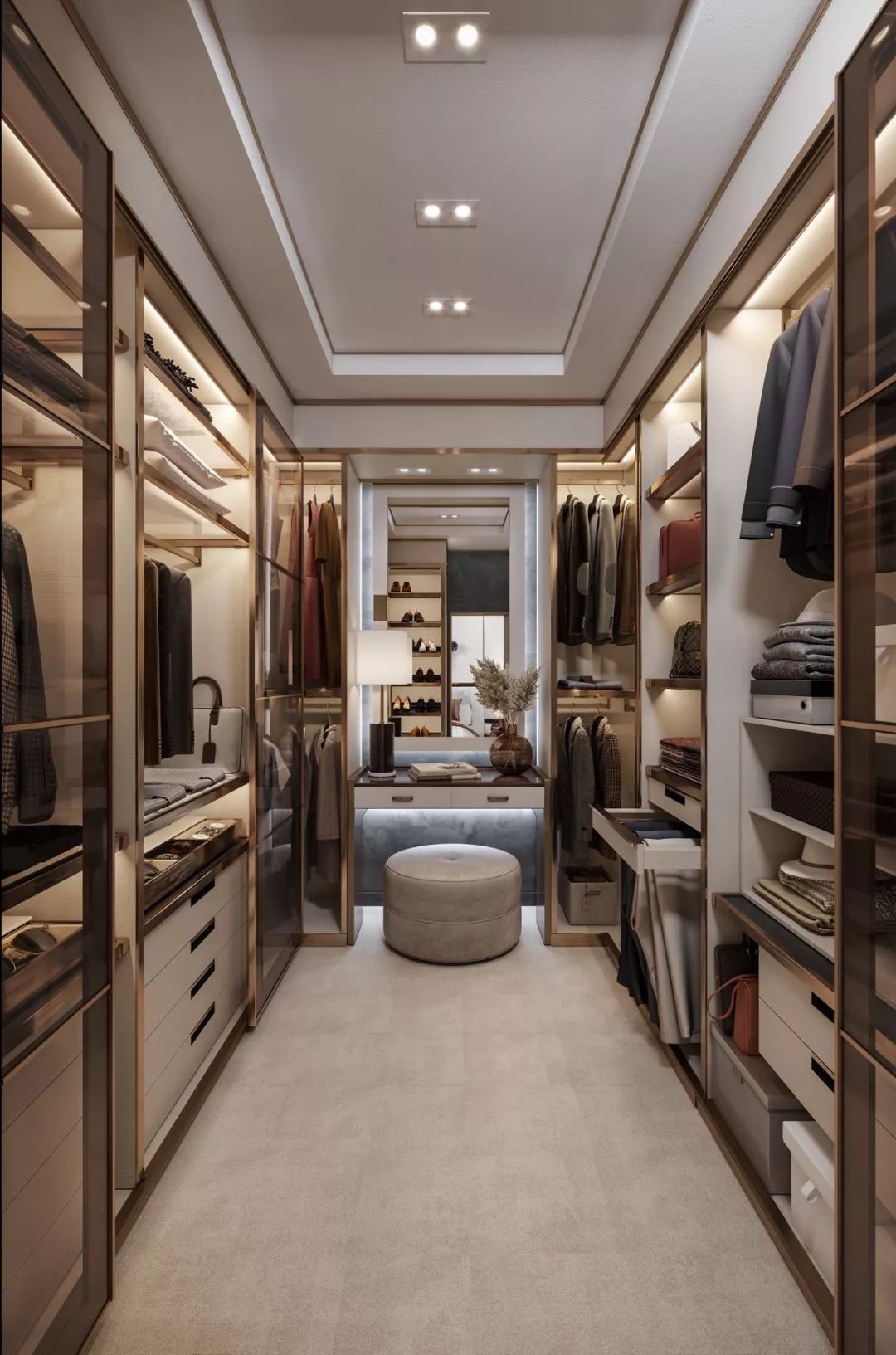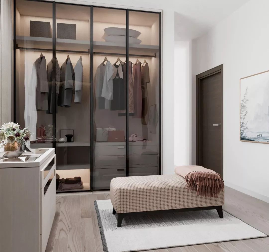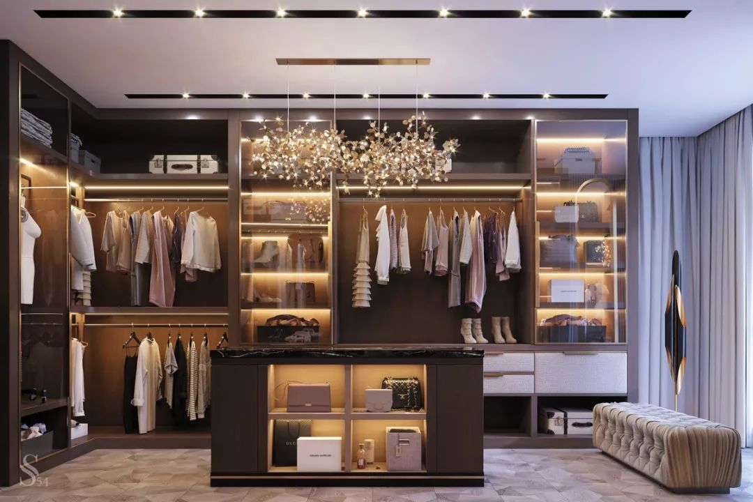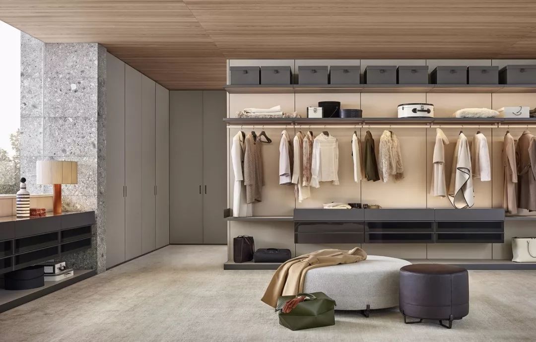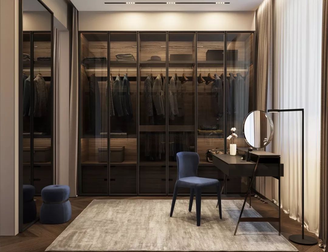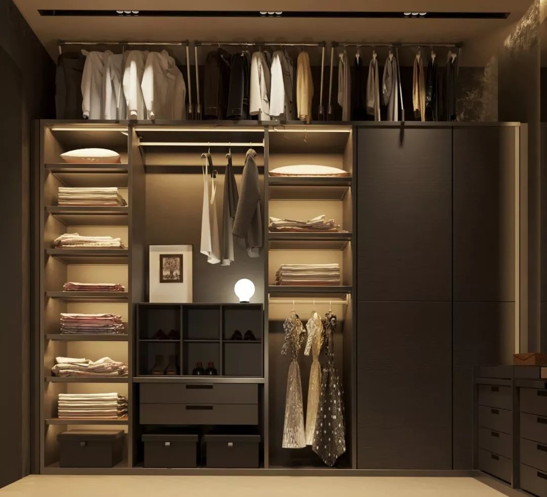 衣帽間的中層空間可以放置西裝、大衣、外套等,盡可能多預留出掛衣空間,并根據衣服的長短分上下橫桿吊掛。