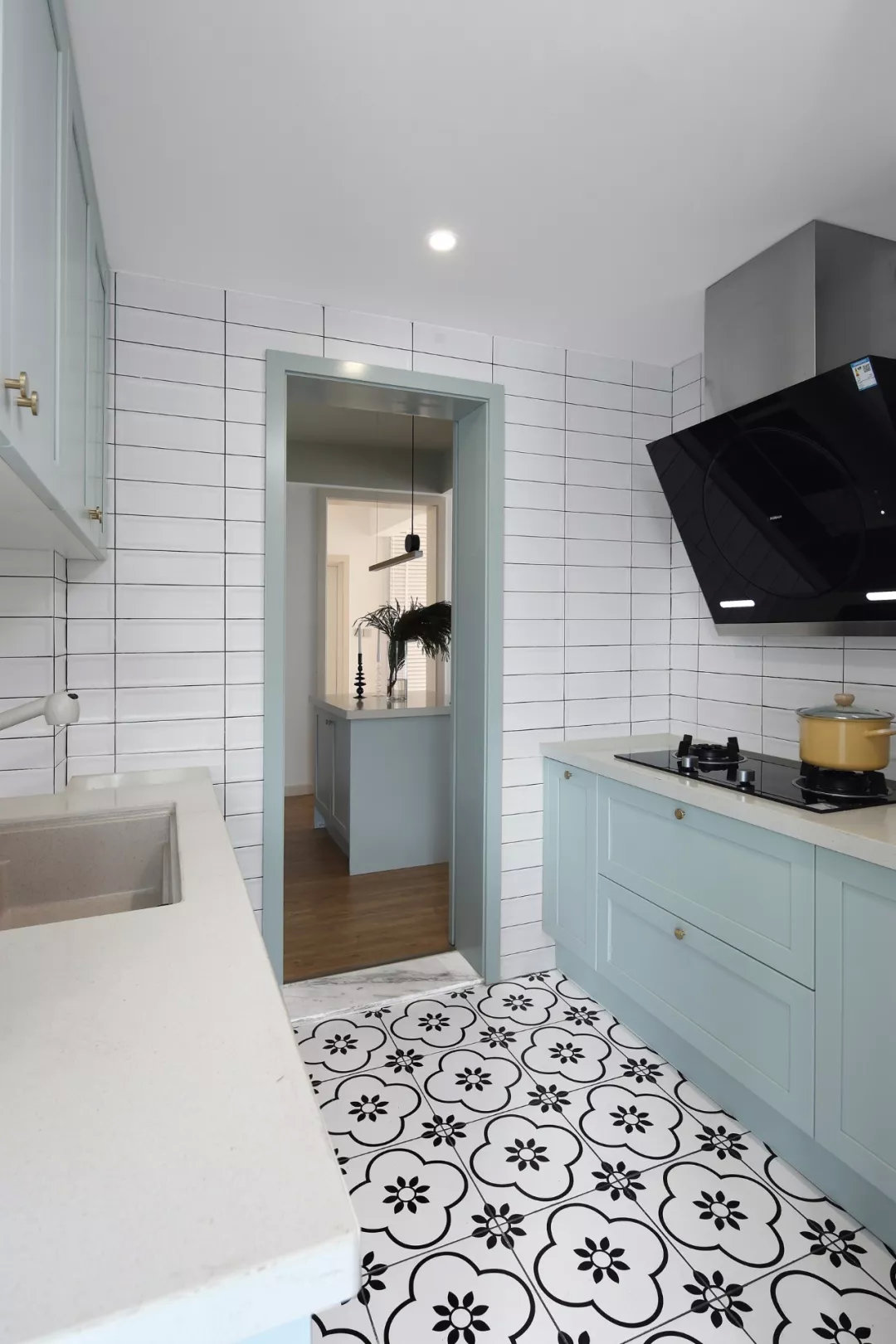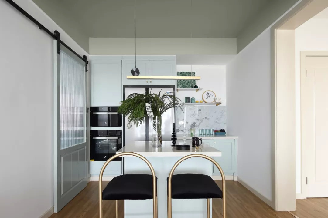 在餐廳的邊上還有一個獨立的廚房空間,廚房還承擔(dān)了走廊過道的責(zé)任,所以櫥柜做了雙一字形的布局方案,上方減少吊柜的設(shè)計,避免廚房顯得太過擁擠。