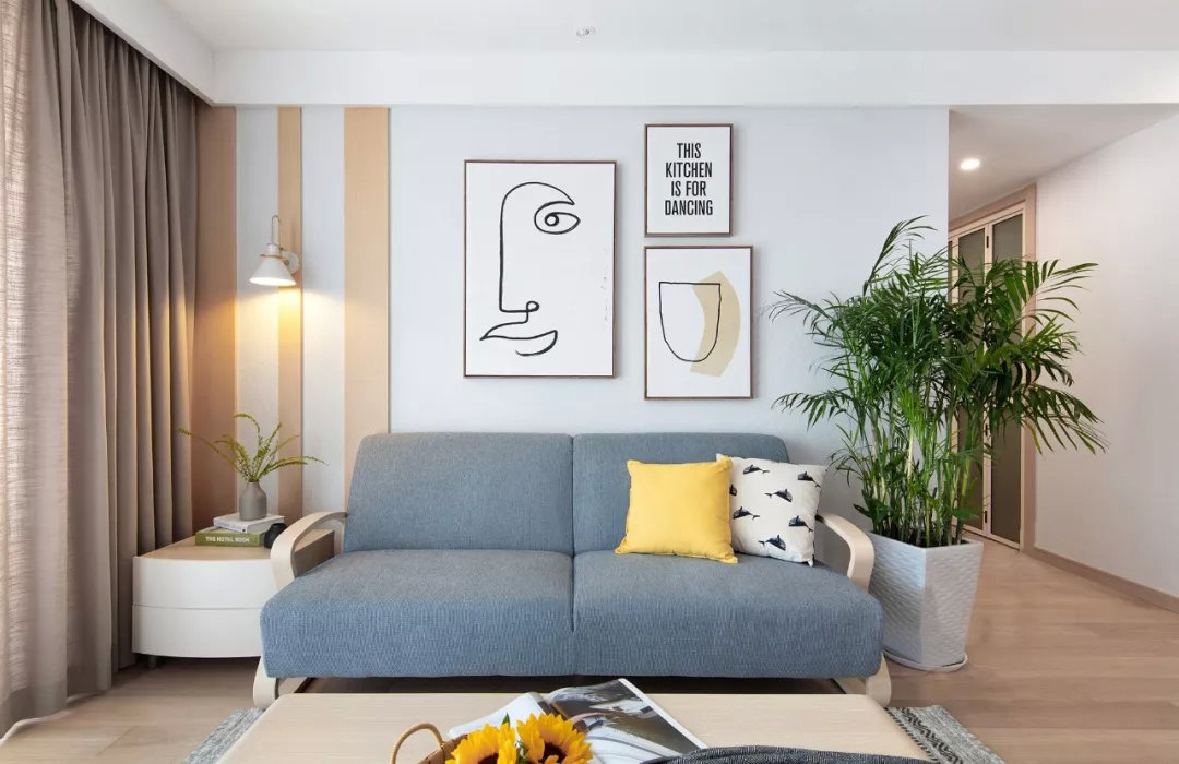 然后家具進場,做好軟裝搭配,布置好窗簾、窗簾桿、沙發、地毯、裝飾畫、植物盆栽等等。